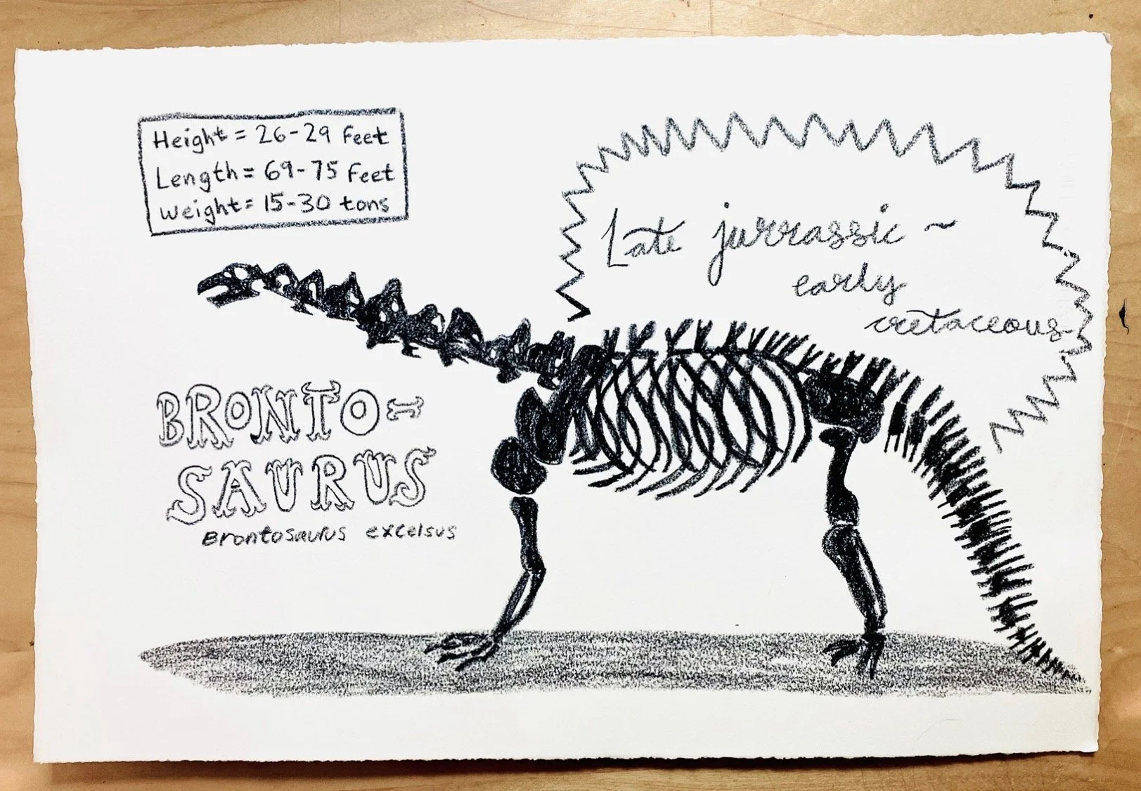 I tried my hardest to replicate this line quality, but I don’t think I ever fully nailed it. His wikipedia page said he used grease pencils, but obviously that was a bald faced lie. The method we eventually settled on was quickly sketching scratchy lines with a dip pen, and then going back over it with a hard, dry brush to break up the line. It worked pretty well, but I don’t think we ever fully nailed it. However, I did draw this brontosaurus skeleton while experimenting with the grease pencils, so that’s okay.