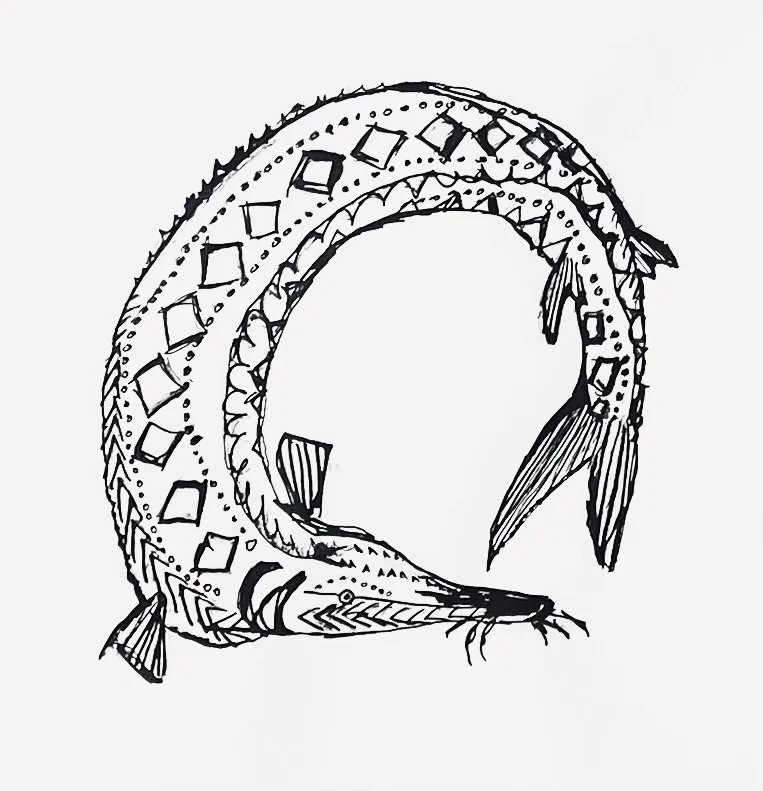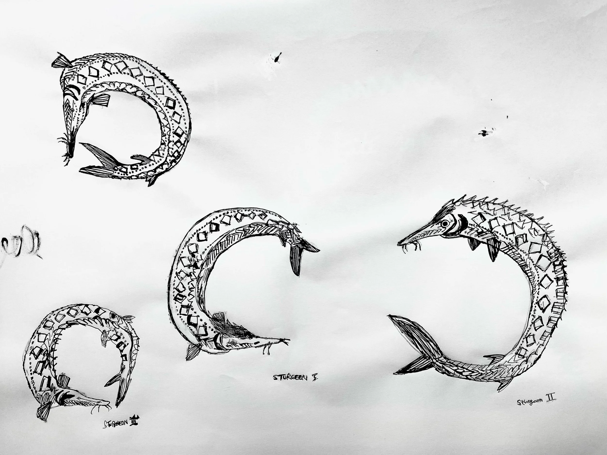 As you can see, I ended up pretty much drawing the same fish four times. I think I managed to improve upon it each time, though! I started with the one in the middle, then went on to the one in the right, then the lower left, and finally the upper left.